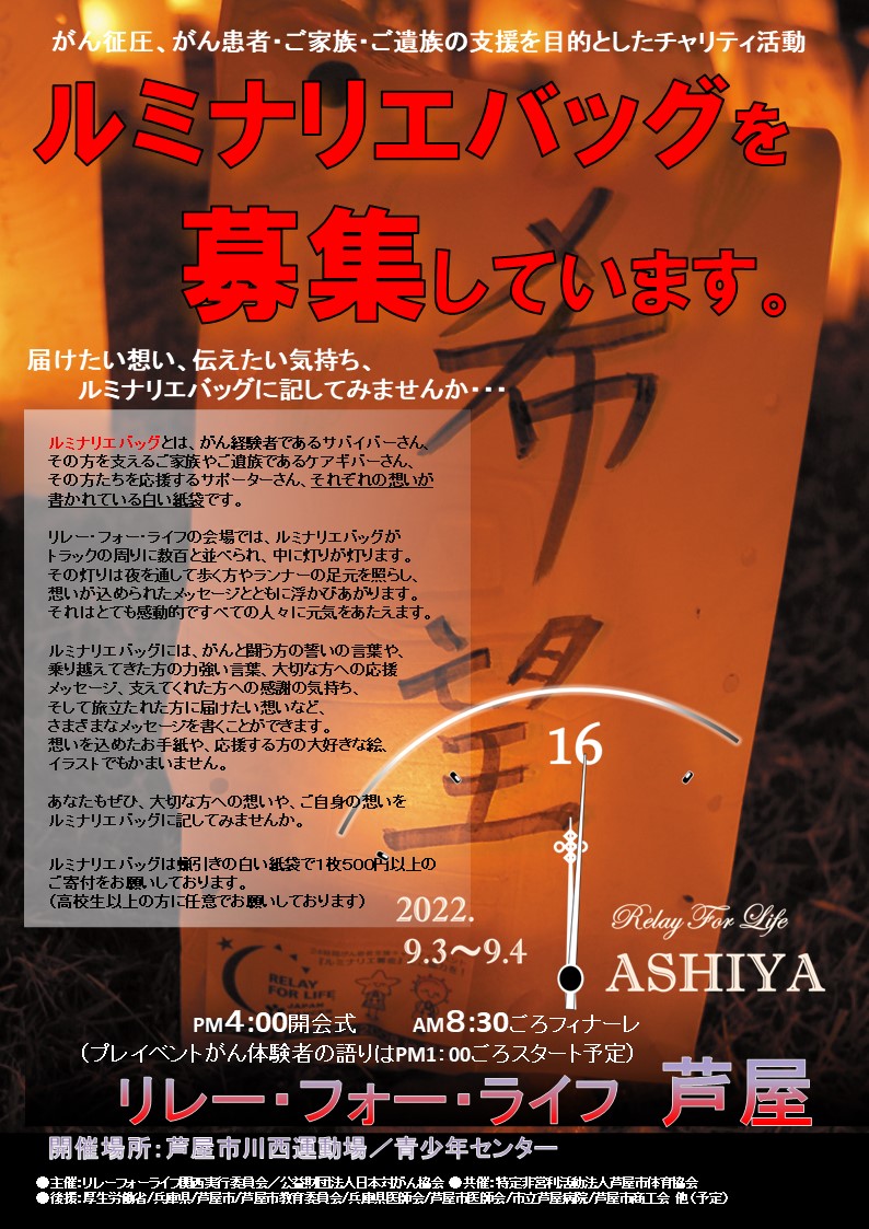 リレー・フォー・ライフ・ジャパン芦屋の会場に、ルミナリエバッグを並べてみませんか?