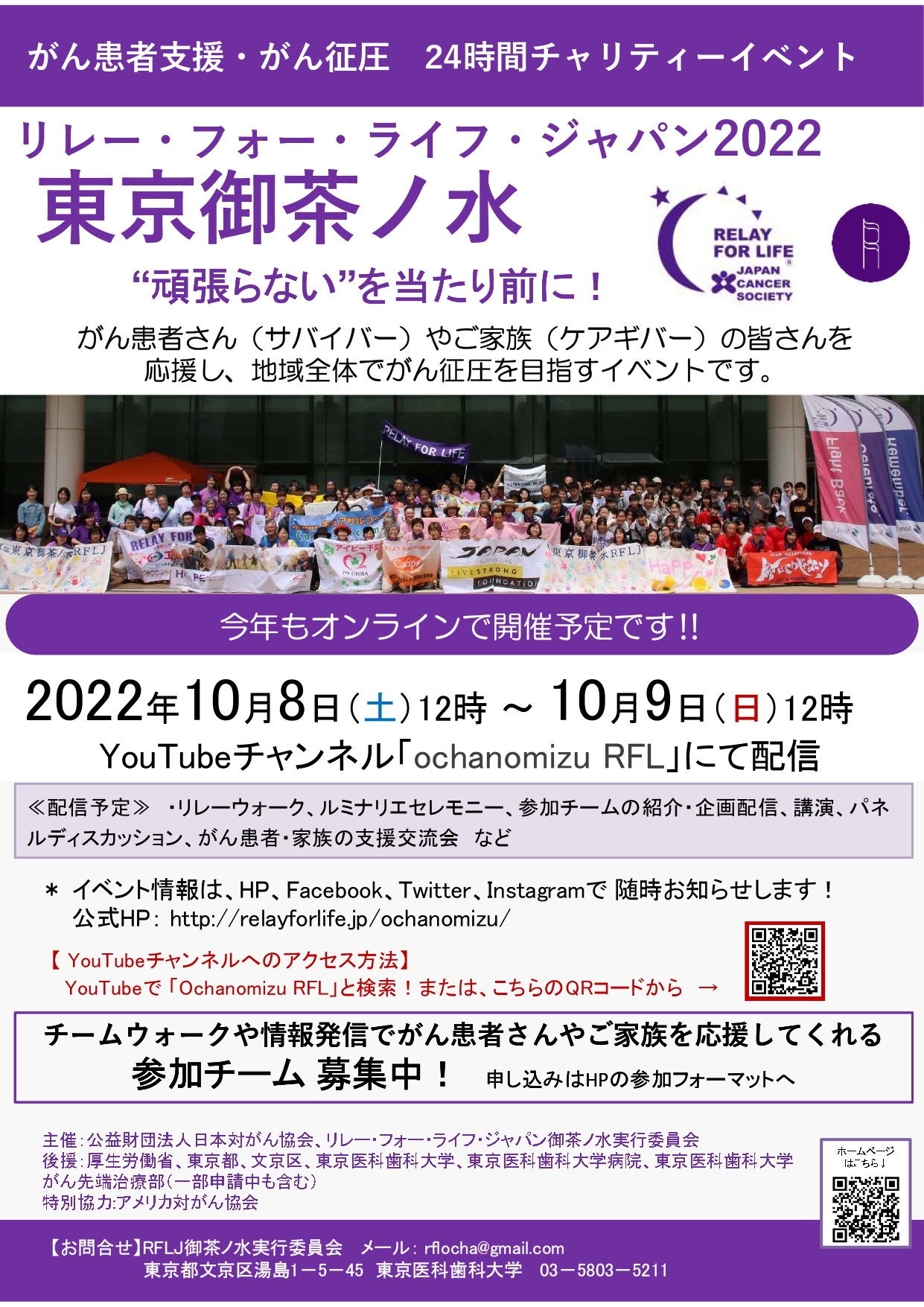 私たち御茶ノ水の実行委員会は10年前の設立当初から「頑張らないを当たり前に」 というスローガンを掲げてきました。がん患者さんやそのご家族が治療を乗り越え元気になることを私たちは願い活動を続けてきました。一方で頑張りすぎている皆さんには無理をせず、周りに助けを求められる環境があればいいなと考えています。御茶ノ水のRFLにはがんを乗り越えた先輩、大切な人を亡くした悲しみを乗り越えた仲間たちがたくさんいます。誰かを応援できる、誰かに助けを求めることのできるそんな場所にしていきたいです。