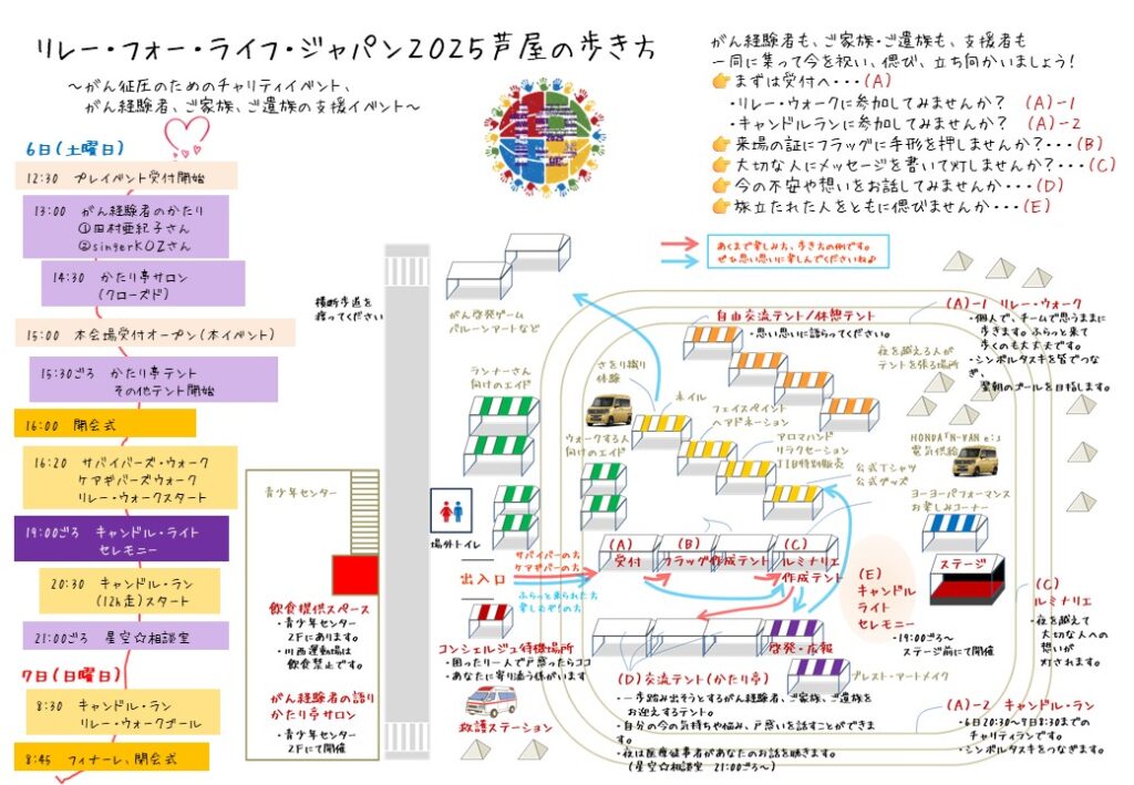 このご案内「リレー・フォー・ライフ・ジャパン2025芦屋の歩き方」は当日パンフレとともにお渡しできる予定ですが、上の画像のクリックするとこのチラシのPDFファイルを表示、ダウンロードすることができます。