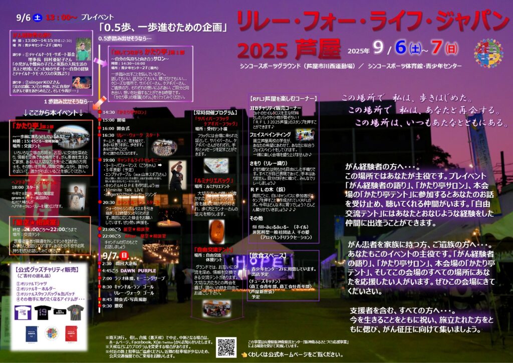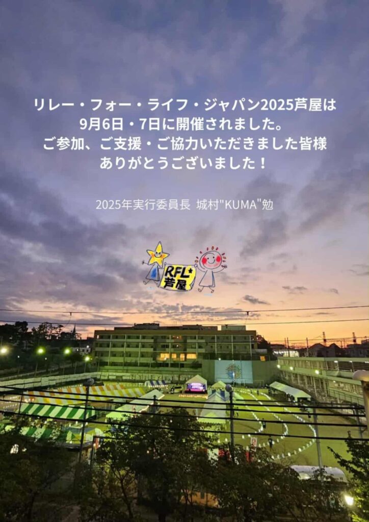 たくさんの方々のご協賛、ご協力により、そして多くの方のご参加、ご来場をいただきまして、9月6日~7日にリレー・フォー・ライフ・ジャパン2025芦屋を開催することができました。
