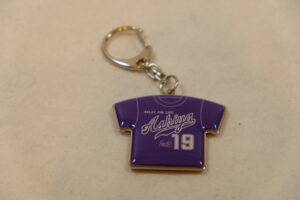 続いては、ユニフォーム風公式Tシャツのカラーリングを反転させたようなユニフォームキーホルダーです。金属製となっていますのでゴージャス感があります。
