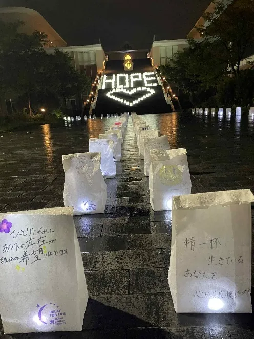 リレー・フォー・ライフ・ジャパン福岡実行委員会(実行委員長 蓑原正己)より、今年度の活動を通じてお寄せいただいたご寄付を、お預かりいたしました。がん征圧に対する日頃からのご支援、ご協力に心より感謝申し上げます。 福岡女子大学での開催もすっかり定着してきて、サバイバーさんなど参加者数も増加してきています。今年も夕方近くから雨模様となりましたが、がん啓発講演、チームブースでの楽しい企画などで、会場は終始活気に溢れていました。
