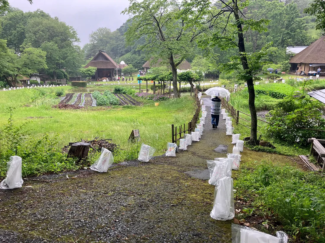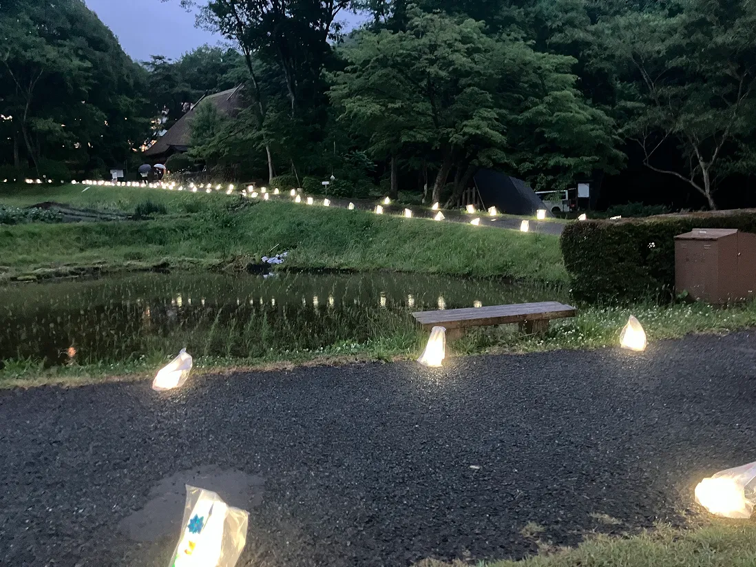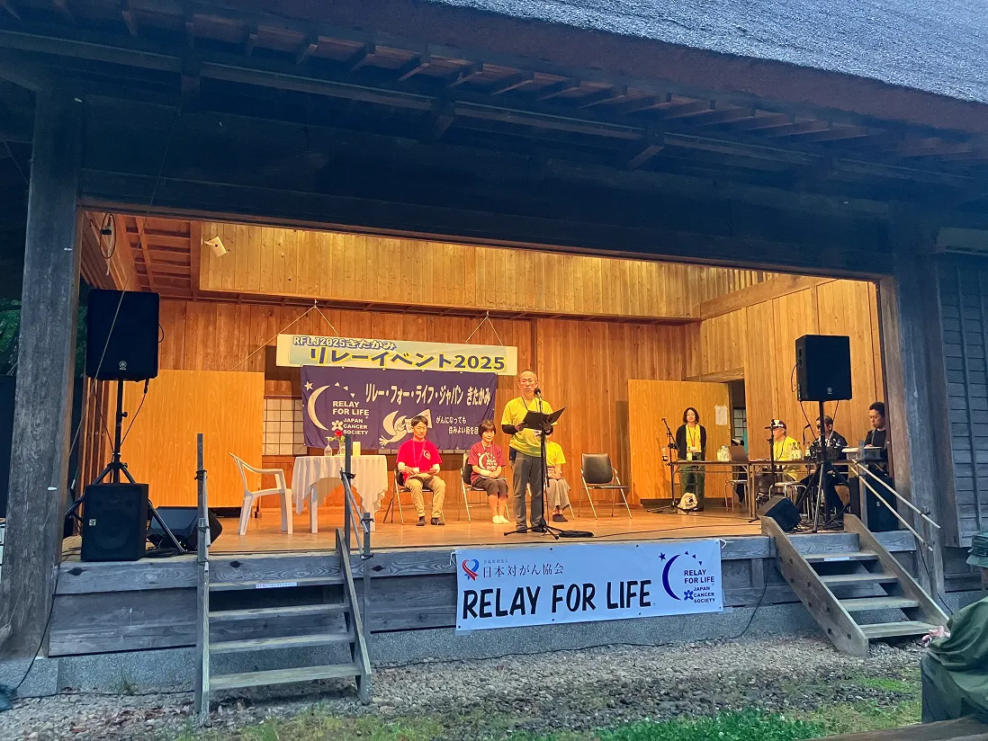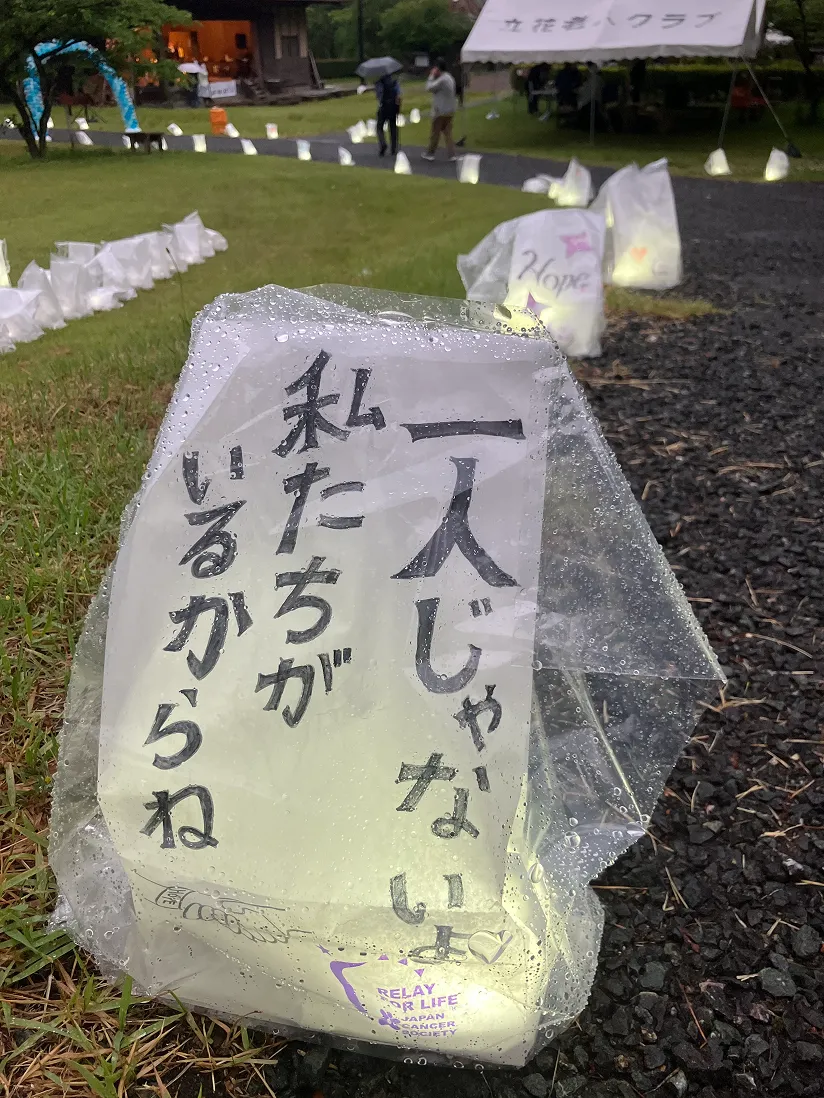 茅葺屋根の古民家が立ち並び、日本の原風景が広がる素敵な会場には、想いの込められたルミナリエが多数並びました。雨が降りだすと、参加者全員がビニールをかけて守ってくださいました。ステージでは癒しの音楽、そしてボランティアで大活躍の高校生や大学生による元気いっぱいのダンス、東北の民謡等が披露され、大変盛り上がりました。医療講演ではアピアランスケアについて、がん専門看護師の方が時に涙をこらえながらお話くださいました。地域の健康を守る北上市からも緩和ケア事業の紹介がありました。ルミナリエセレモニーが始まる頃には雨も弱まり、大切な人への手紙とエンプティーテーブルの詩が朗読され、ここに来ることが叶わなかった方たちに想いを寄せることができました。その後予定を変更して閉会式を早め、RFLJ2025きたかみは無事に閉会致しました。