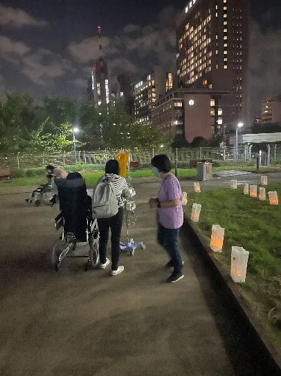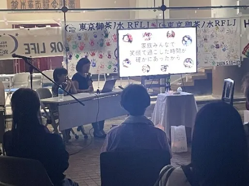 辺りが夕闇につつまれルミナリエにあかりが灯る中、RFL応援ソング「命のリレー」を作っていただいたJ-BANDさんの生演奏が行われたあと、エンプティーテーブルセレモニーが始まりました。幼くして大切な息子さんを天へと見送られた照井さんの体験談が語られ、涙を誘いました。黙祷から詩の朗読、サイレントウォークからナイトウォークへと続いていきました。車いすに乗った入院患者さんが親子で来場、並べられたルミナリエを眺めながらコースを1周している姿は、御茶ノ水ならではの場面、病気と向き合う勇気となったのではと思います。