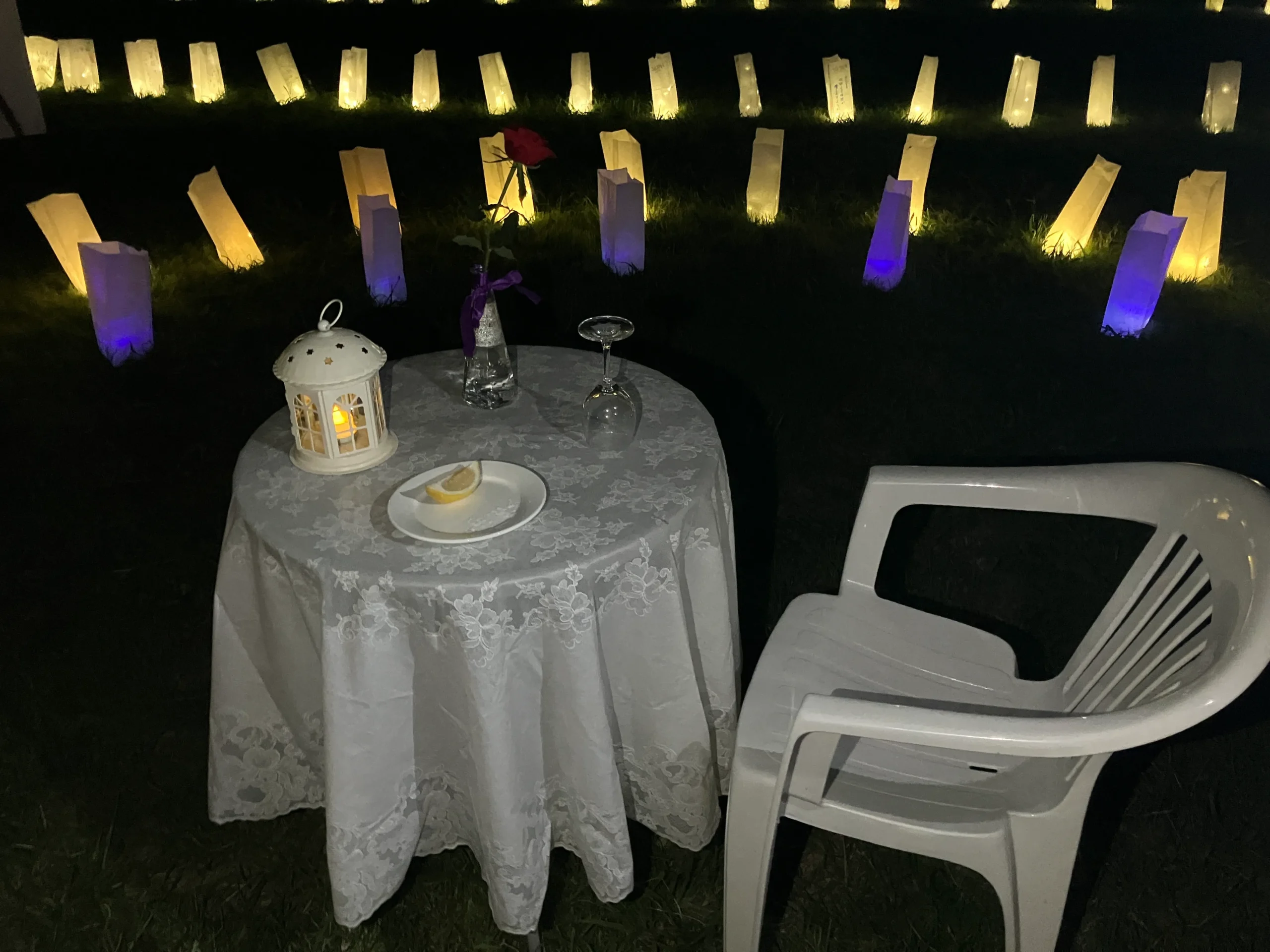 夜になるとルミナリエ点灯とエンプティテーブル・セレモニーが行われ、静かな灯りの中で旅立った方や今日ここに来られなかった方々に想いを寄せました。