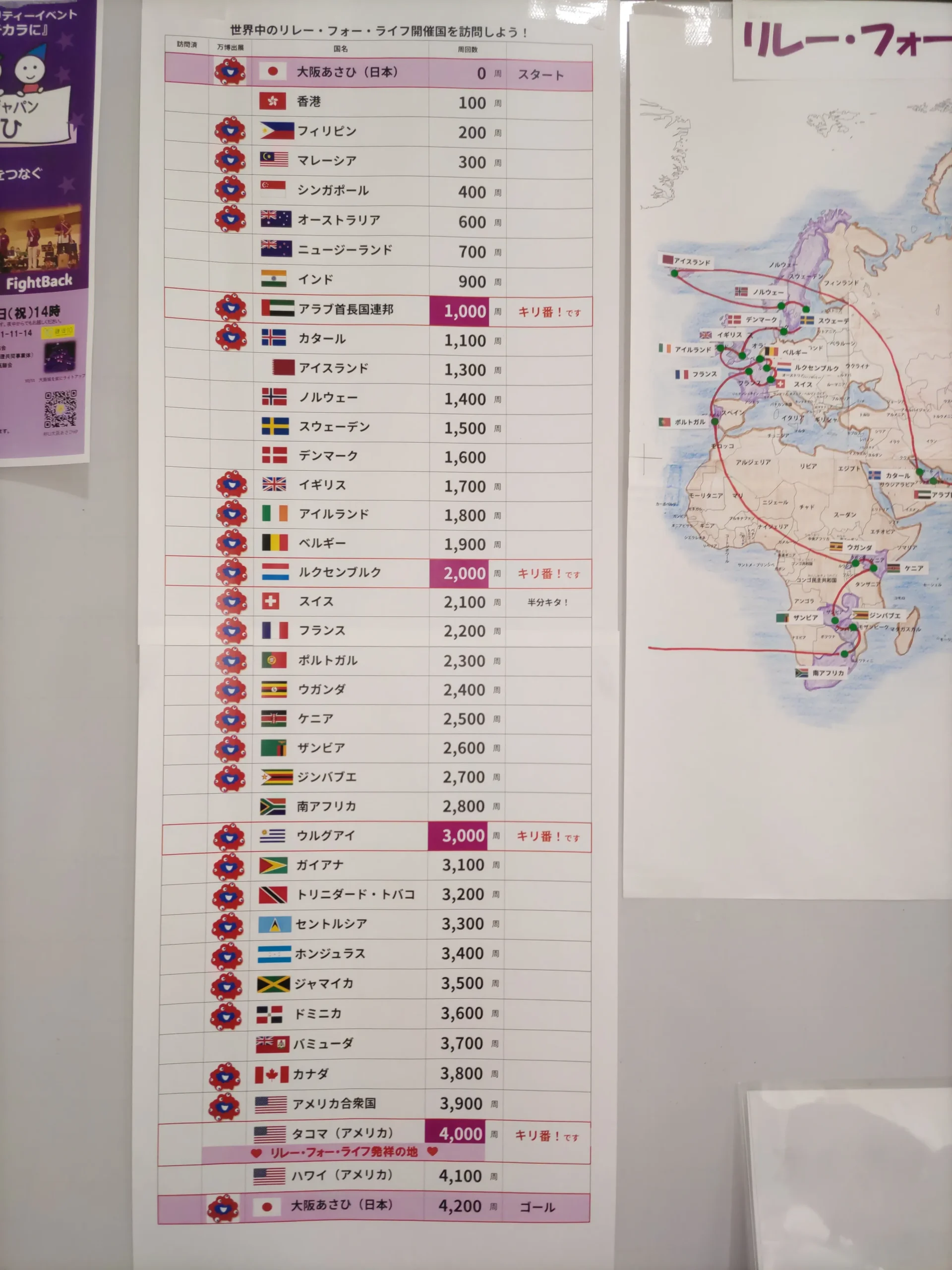 大阪あさひ恒例の会場を一周回るごとにカウンターを押す<ポチっとな>。今年は大阪万博に出展している国を目指して歩きました。皆さんのご協力により、無事に大阪あさひに帰ってくることができました。