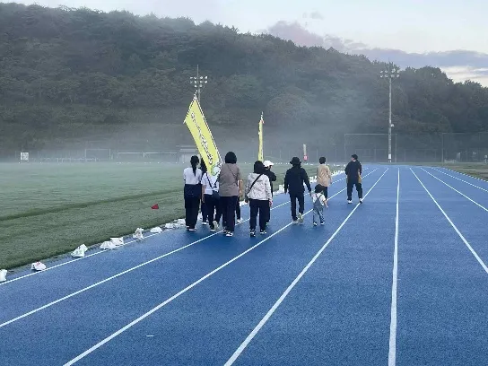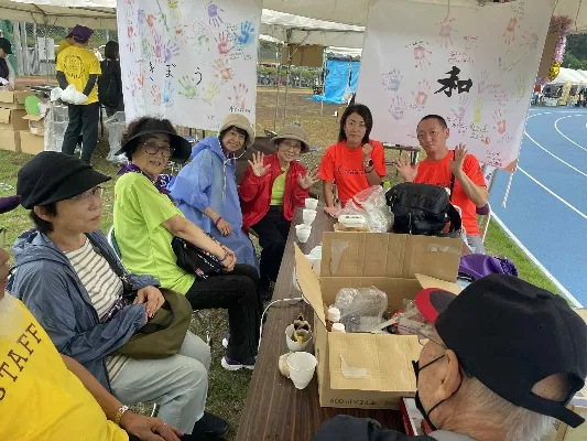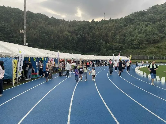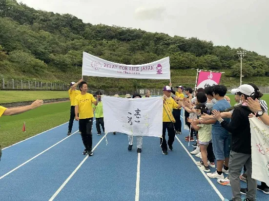 RFLJ2025中津は、14時開始予定でしたが、大きな雨雲が近づきつつあり、遠くで雷鳴も響く状況となり、開始時間を急遽約15分前倒しして始まりました。実行委員長の開始の合図に続いてサバイバーズラップをみんなで見送った後、やむを得ずリレーウォークを行うと言う変則的な開始となりました。一時、雷雨が強くなり、競技場観覧席屋根の下やテントへ退避する安全対策を臨機応変に取りながら行いましたが、会場内は終始穏やかな雰囲気に包まれ、参加された方も思い思いに楽しく過ごされていました。