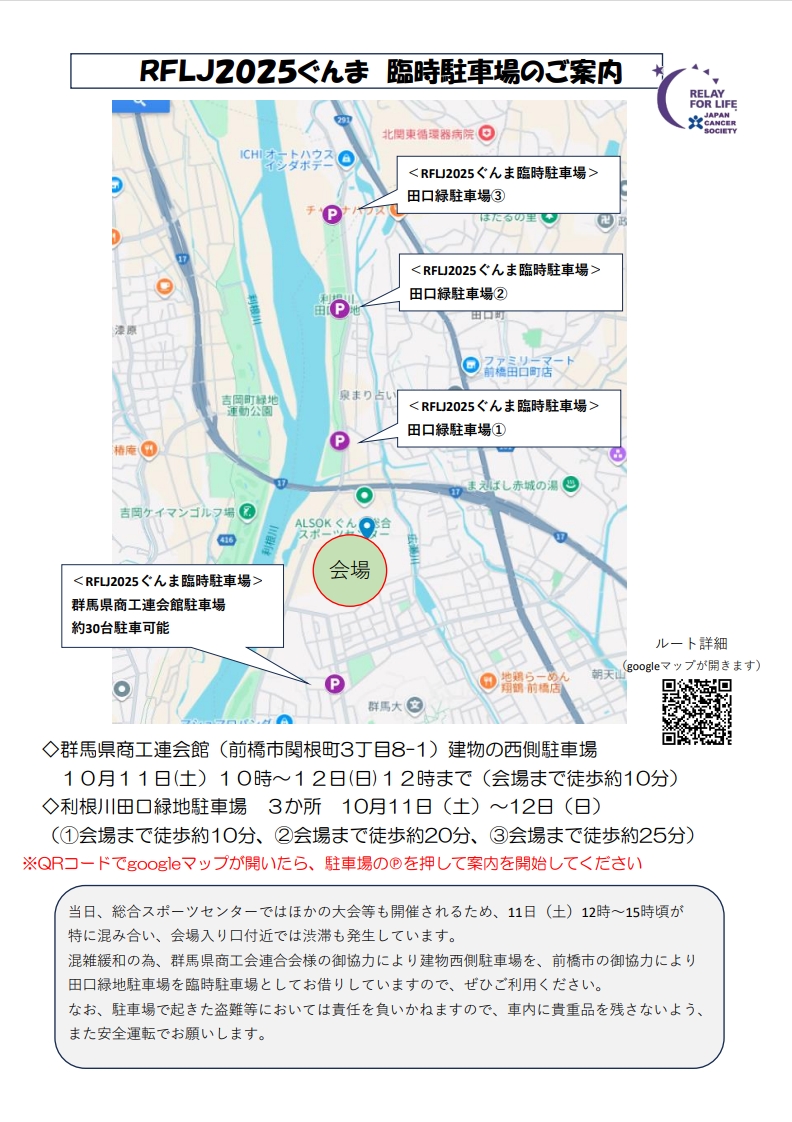 2025年09月01日 臨時駐車場のお知らせ RFLJ2025ぐんまの開催日である10月11日(土)、12日(日)は同会場で他のイベントも行われ駐車場の混雑が見込まれます。 臨時駐車場として下記が使用可能で…続きを読む