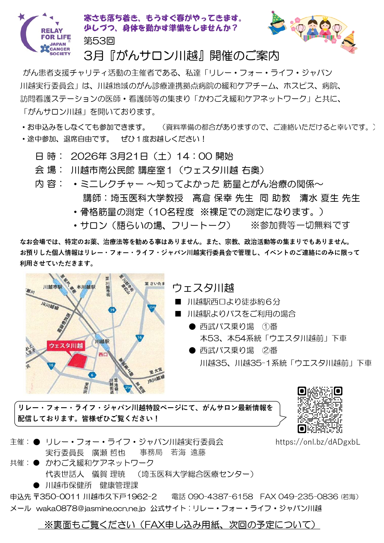 がん患者さんやそのご家族を支援し、地域全体でがんと向き合い、がん征圧を目指すチャリティ活動です。この活動は、年間を通じて行われ、この「がんサロン川越」は、リレー・フォー・ライフ・ジャパン川越の活動の一環として行われています。