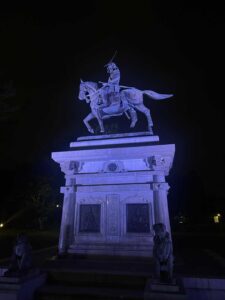 今、仙台城跡の伊達政宗公騎馬像がRFLのイメージカラー「ドーンパープル」にライトアップされています。