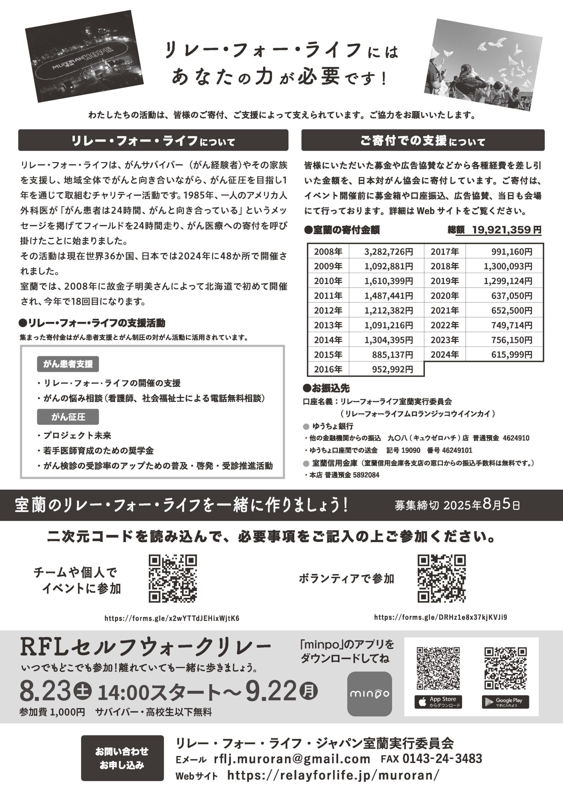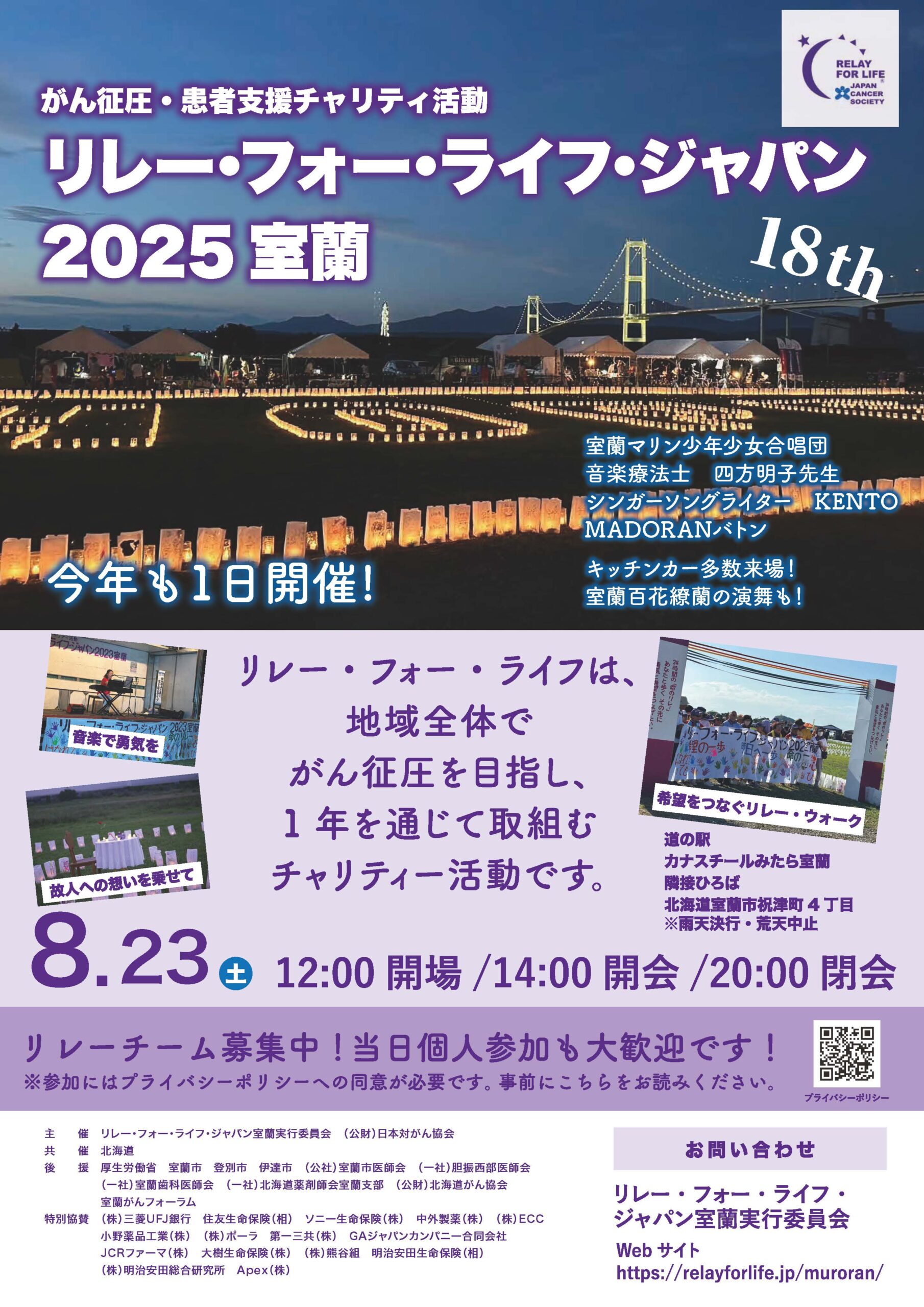 「リレー、フォー・ライフ・ジャパン2025室蘭」は8月23日(土)に実施する運びとなりました。
