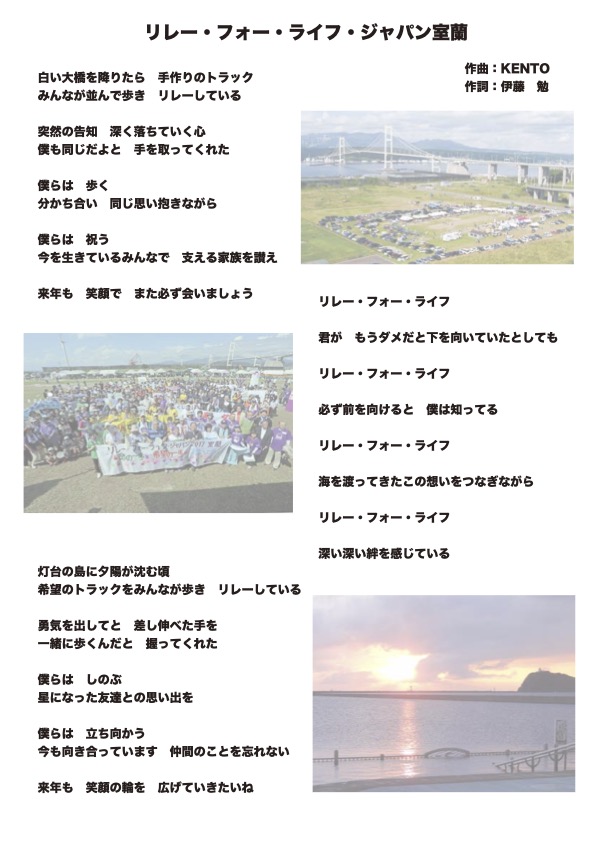 昨年、室蘭在住のシンガーソングライター・KENTOさんが、リレー・フォー・ライフ・ジャパン室蘭のためにオリジナルソングを作ってくださいました!