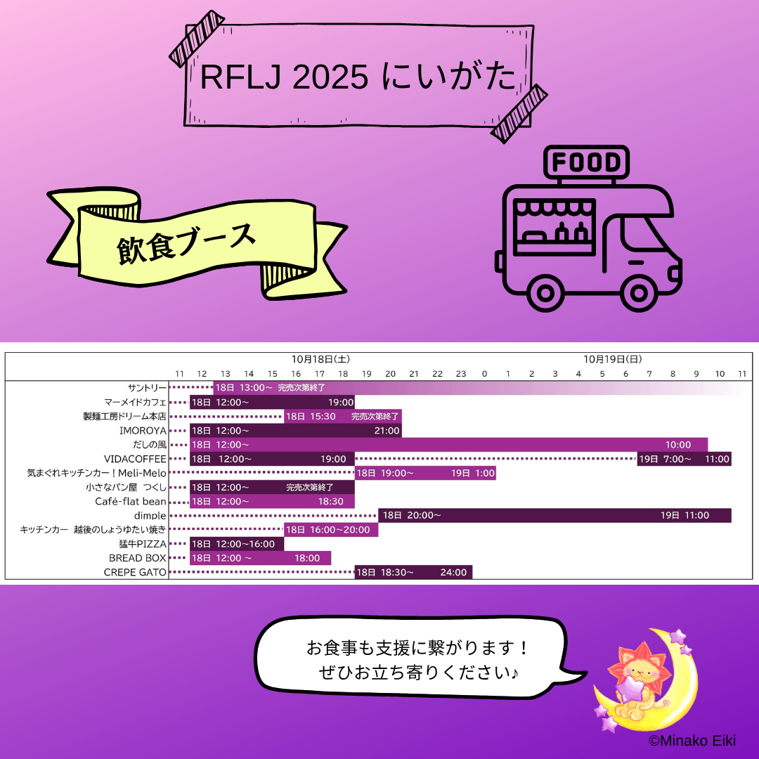 2025年10月14日 【RFLJ 2025 にいがた】飲食ブースのご案内 イベント当日は、キッチンカーなどの飲食ブースも充実しています! お食事も支援になりますのでぜひお立ち寄りください♪ <各店舗の出店時間(目安)> マーメイドカフ…続きを読む