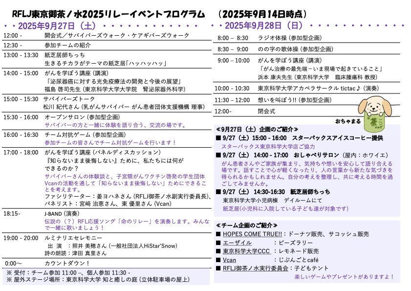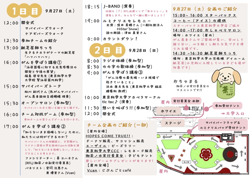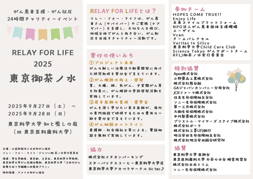 私たち御茶ノ水の実行委員会は10年前の設立当初から「頑張らないを当たり前に」 というスローガンを掲げてきました。がん患者さんやそのご家族が治療を乗り越え元気になることを私たちは願い活動を続けてきました。一方で頑張りすぎている皆さんには無理をせず、周りに助けを求められる環境があればいいなと考えています。御茶ノ水のRFLにはがんを乗り越えた先輩、大切な人を亡くした悲しみを乗り越えた仲間たちがたくさんいます。誰かを応援できる、誰かに助けを求めることのできるそんな場所にしていきたいです。