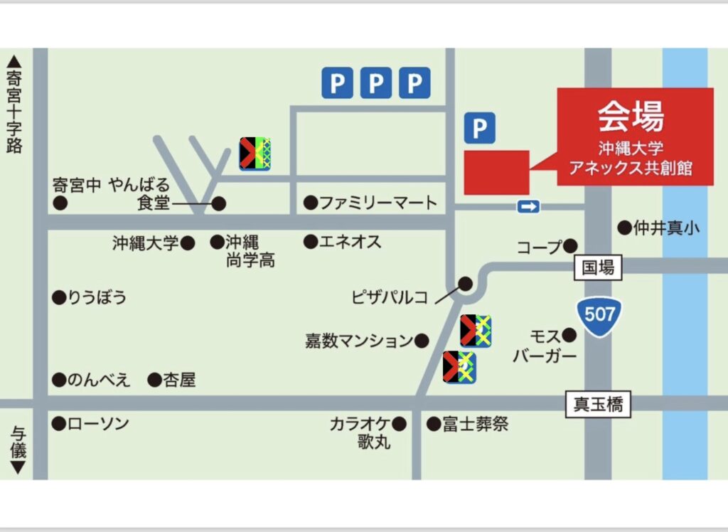 共創館横の駐車場、そしてファミリーマート裏の駐車場を使って頂けます。