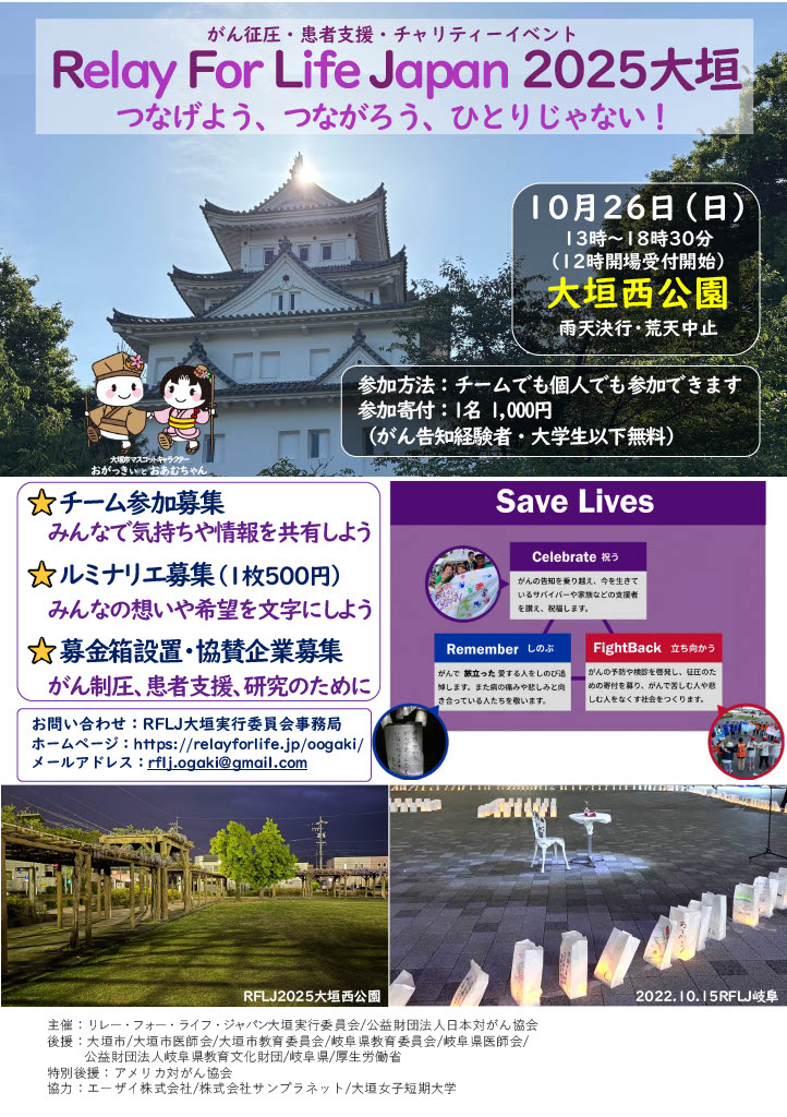 「ひとりじゃない」というメッセージを大切にし、想いをつなぐリレー・フォー・ライフ・ジャパン大垣でありたいと願っています。ぜひ、大垣でのイベントにお越しいただき、つながりを広げ、深めていただければ幸いです。