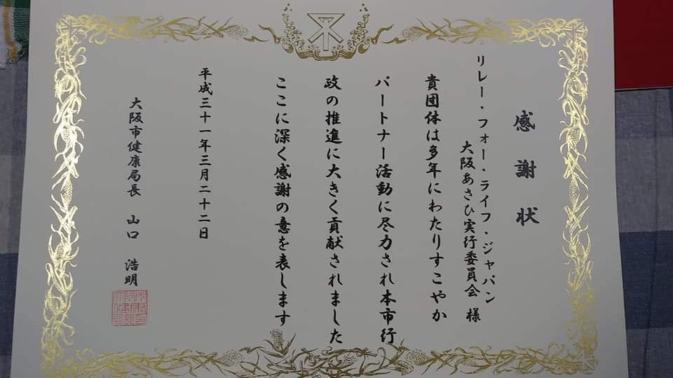 2019年03月22日 継続は力なり! 今日はいつもと逆で感謝状をいただきました‼️ 大阪市健康局『すこやかパートナー』から多年に渡った活動に対してだそうです。 継続は力なりです~!!