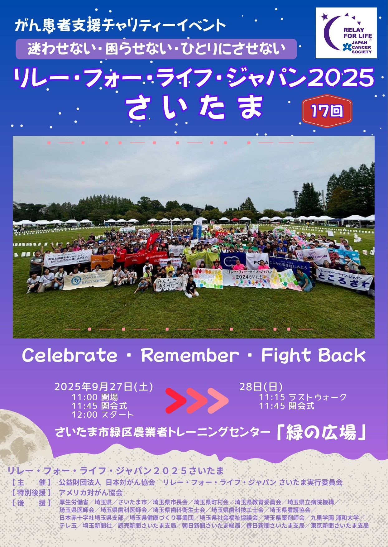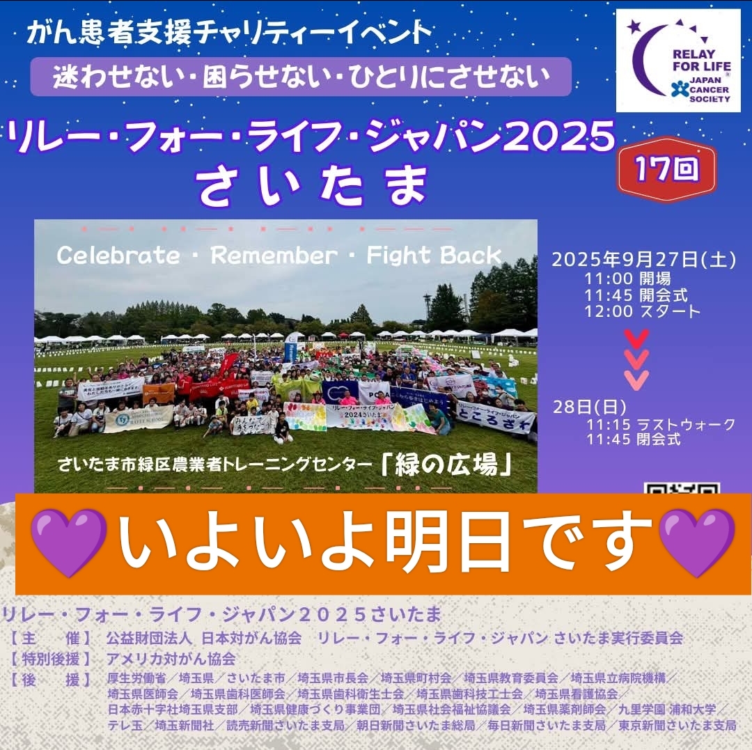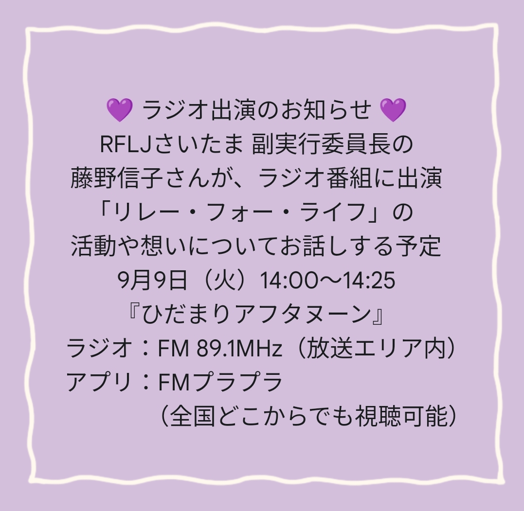 2025年09月02日 ラジオ出演のお知らせ リレー・フォー・ライフ・ジャパンさいたま 副実行委員長の藤野信子さんが、ラジオ番組に出演いたします🎊 番組内では、「リレー・フォー・ライフ」の活動や想いについて…続きを読む