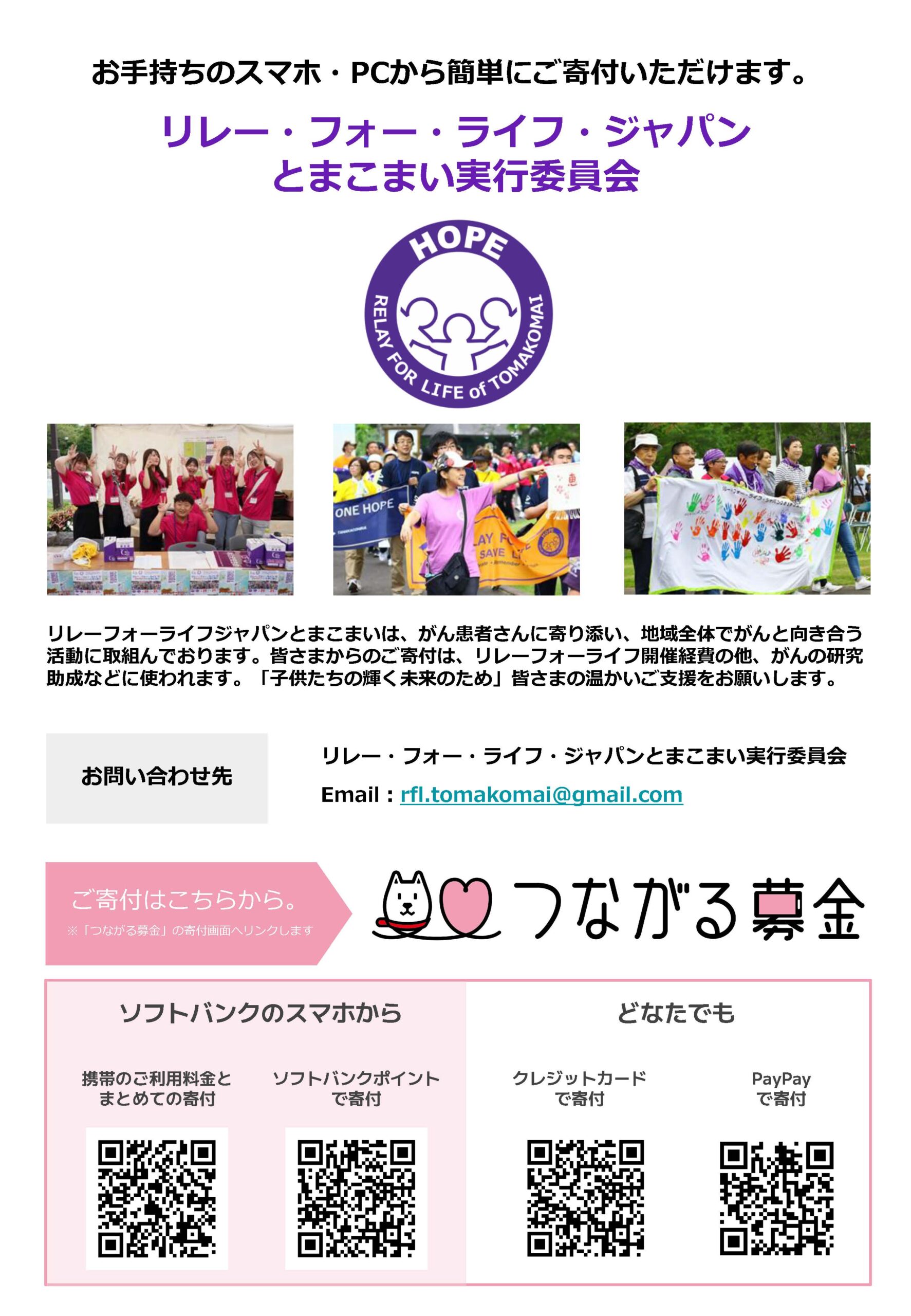 お預かりしましたご寄付は、「リレー・フォー・ライフ・ジャパン2025とまこまい」の協賛金として大切に活用させていただきます。